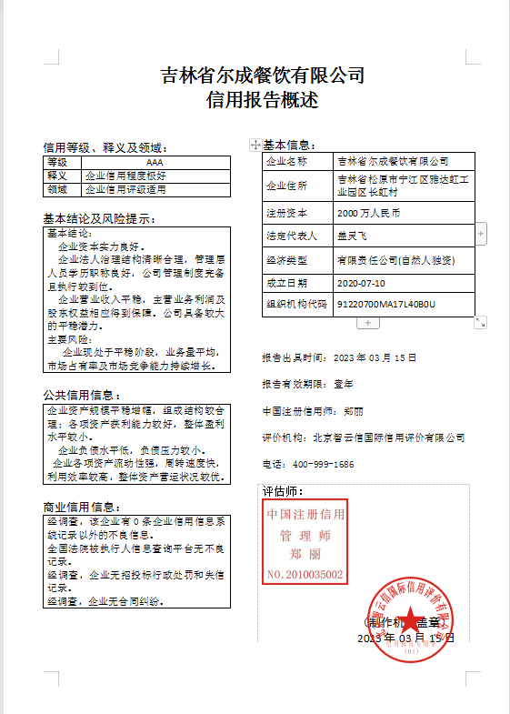 二、本信用證書(shū)和信用檔案是中立和中性的,它證明該單位已納入社會(huì)信用體系的監(jiān)督之中,任何組織和個(gè)人可以遵循誠(chéng)信原則方便地對(duì)該單位進(jìn)行評(píng)價(jià)(表?xiàng)睢⑴u(píng)、建議);任何組織和個(gè)人可以方便地查詢?cè)搯挝涣己眯畔?、不良信息和整改信息。該單位也可以通過(guò)誠(chéng)信經(jīng)營(yíng)不斷增加信用分值和增加良好信用信息記錄,積累信用無(wú)形資產(chǎn)。三、根據(jù)該單位提供的相關(guān)資料,依據(jù)中華人民共和國(guó)信用行業(yè)標(biāo)準(zhǔn)Q/ZYX 002-2019《企業(yè)信用評(píng)價(jià)體系標(biāo)準(zhǔn)》,專(zhuān)業(yè)第三方信用評(píng)價(jià)機(jī)構(gòu)或信用認(rèn)證機(jī)構(gòu)對(duì)其信用等級(jí)評(píng)定為:AAA 級(jí)。四、提醒該信用檔案、信用證書(shū)及信用銘牌的使用者:請(qǐng)密切關(guān)注合作和交易對(duì)方的各項(xiàng)信用指標(biāo)或最新信用報(bào)告或年檢記錄信息,整體把握信用風(fēng)險(xiǎn),以保障合作和交易安全;請(qǐng)隨時(shí)關(guān)注合作和交易對(duì)方的信用動(dòng)態(tài)變化或跟蹤評(píng)價(jià)報(bào)告,及時(shí)把握信用趨勢(shì),以掌控商業(yè)風(fēng)險(xiǎn)。信用是企業(yè)的生命線;信用檔案是企業(yè)信用評(píng)價(jià)結(jié)果的動(dòng)態(tài)記錄,具有法律效力的信用證書(shū)是企業(yè)、商家及網(wǎng)站的第二“信用身份證”,信用檔案和信用證書(shū)是企業(yè)、商家及網(wǎng)站獲得客戶信任、促成合作和交易的基礎(chǔ),是大眾消費(fèi)、合作和交易決策的重要依據(jù),是我國(guó)社會(huì)信用體系建設(shè)的公平保障體系。